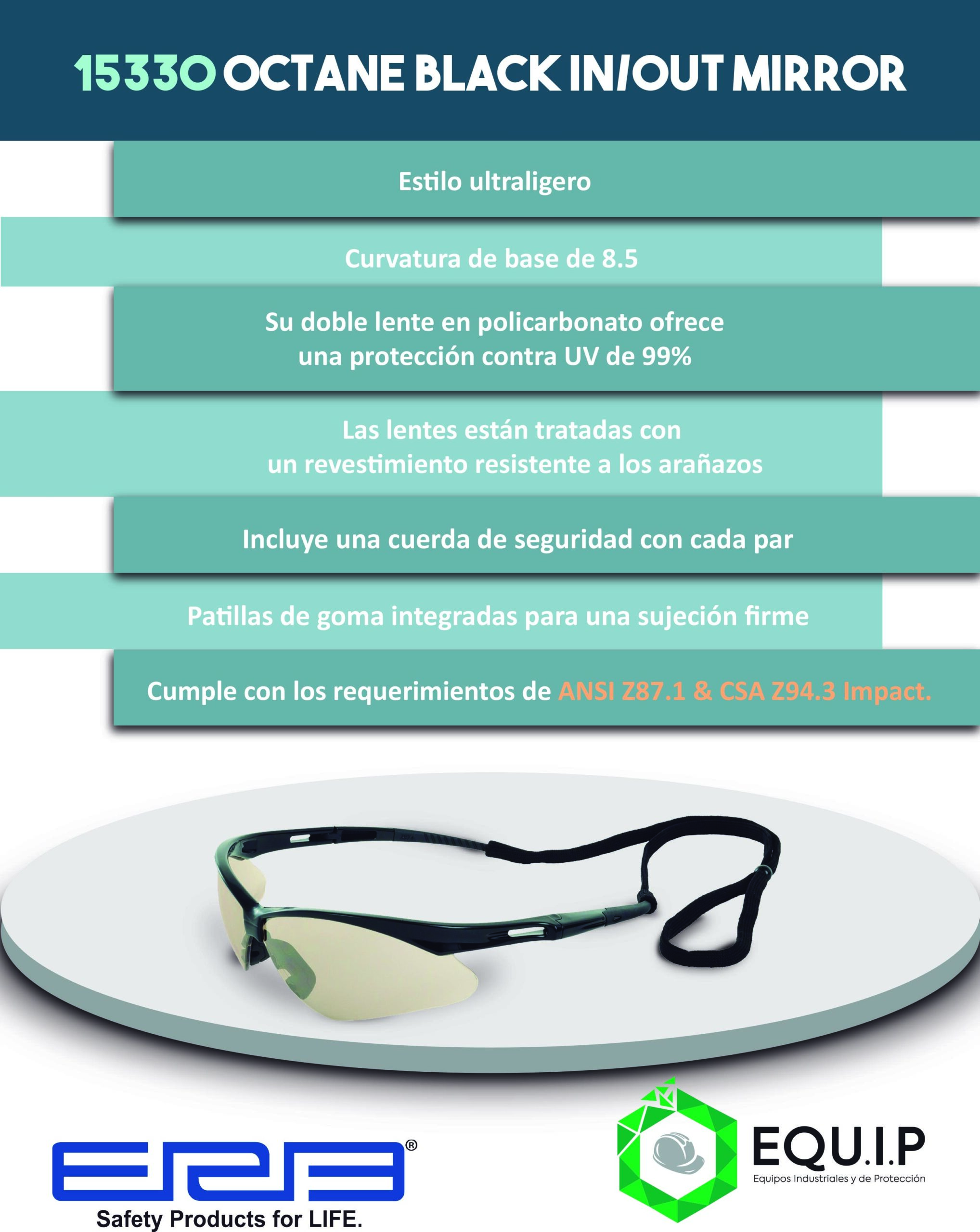 Descripción: Estilo deportivo y ultraligero. Su doble lente en policarbonato ofrece una protección contra UV de 99%. Las lentes están tratadas con un revestimiento resistente a los arañazos.