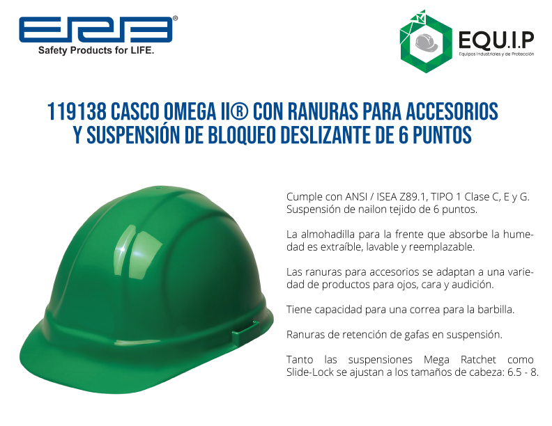 Descripción: Moldeado de poliuretano de alta densidad para una máxima protección.4 puntos de suspensión de nylon tejido.Permite ajustar barbiquejo. Cumple con ANSI / ISEA Z89.1, TIPO 1 Clase C, E y G.