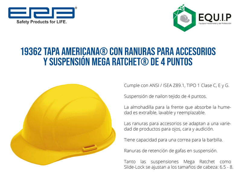 Descripción: Cumple con ANSI / ISEA Z89.1, TIPO 1 Clase C, E y G. Suspensión de nailon tejido de 4 puntos. La almohadilla para la frente que absorbe la humedad es extraíble, lavable y reemplazable.