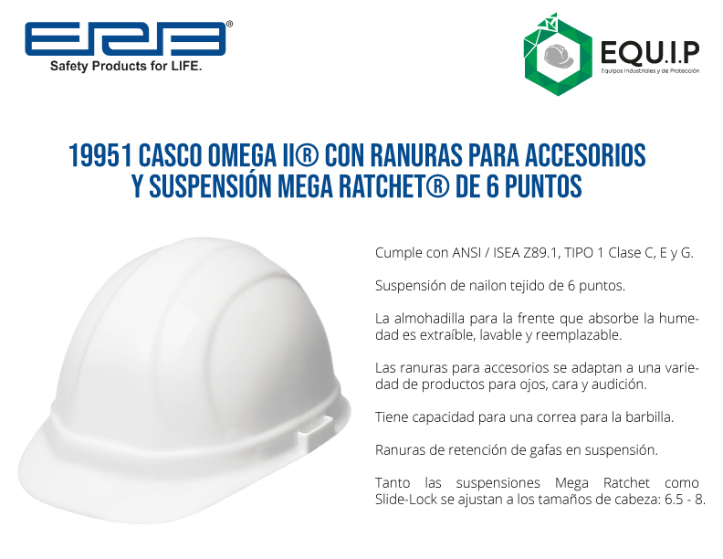 Descripción: Cumple con ANSI / ISEA Z89.1, TIPO 1 Clase C, E y G. Suspensión de nailon tejido de 6 puntos. La almohadilla para la frente que absorbe la humedad es extraíble, lavable y reemplazable.