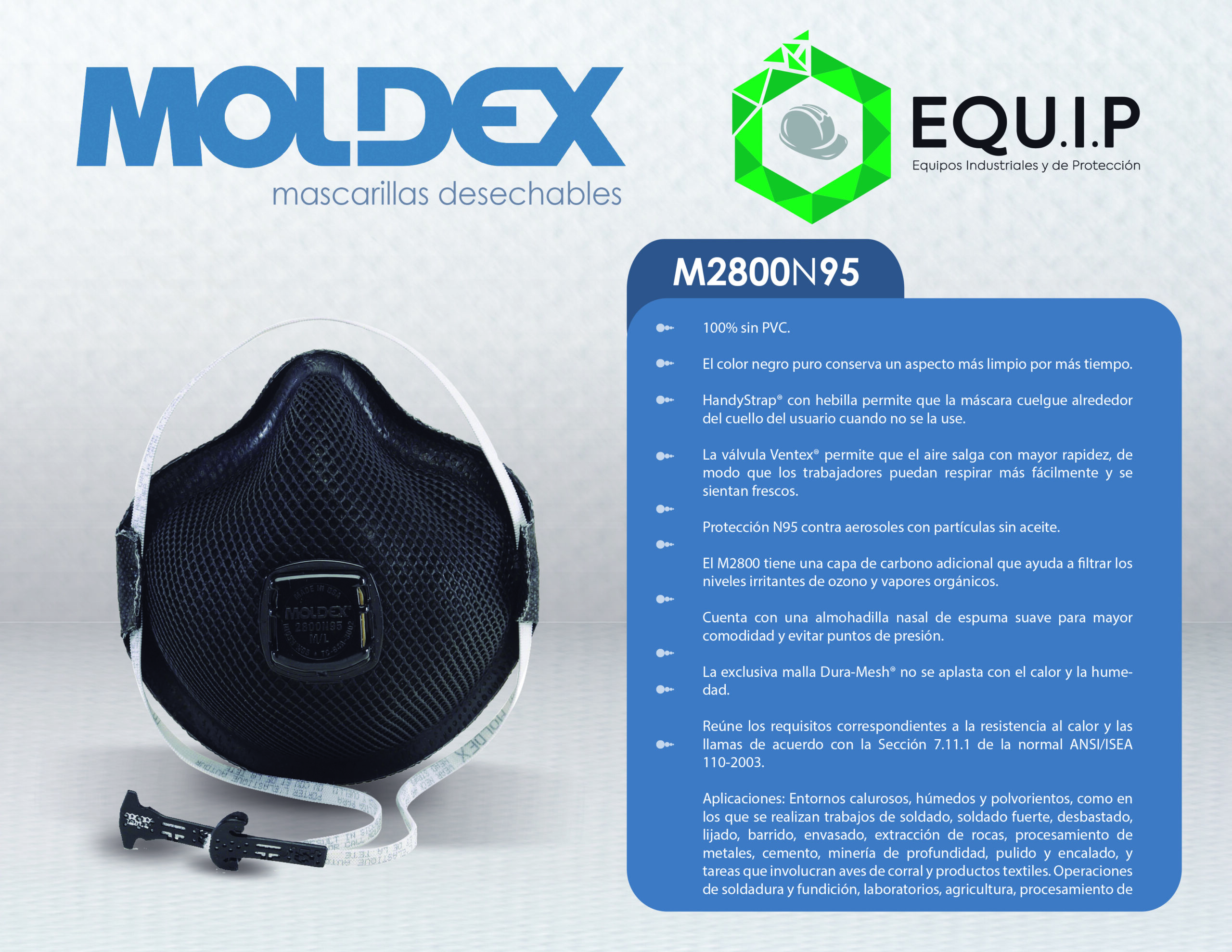 Descripción: 100% sin PVC. La malla Dura-Mesh® no se aplasta con el calor y la humedad. El puente nasal moldeado se sella fácilmente, sin una banda metálica para la nariz. La mascarilla está moldeada de forma natural sin puntos de presión.